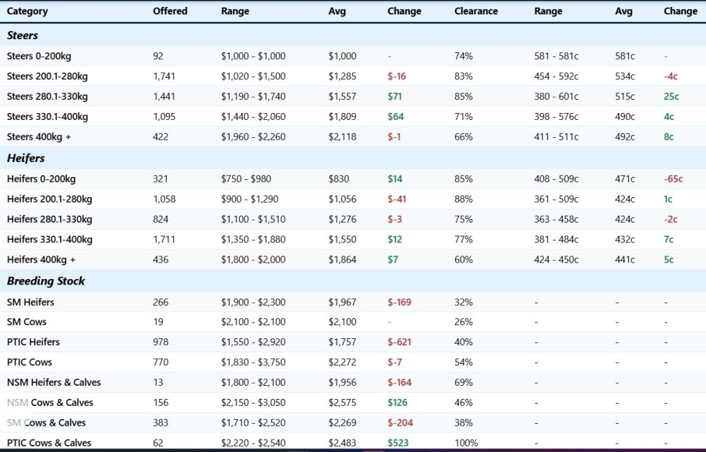 Steers were the standout category, with 4,865 head presented and a robust clearance rate of 79%. Interestingly, medium and heavier weight steers saw price increases, while lighter categories experienced slight declines or were considered too small to quote.