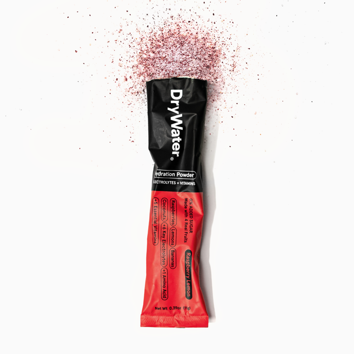 The new Raspberry Lemon hydration powder taps into DryWater’s advanced hydration formula to support cellular rehydration and deliver health benefits without added sugar or stevia. Dissolve a stick of Raspberry Lemon into 12 to 16 ounces of water daily to experience the effect of DryWater’s powerhouse blend of six key electrolytes, five essential vitamins, one amino acid, and real whole fruits.