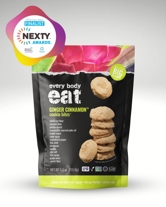 EVANSTON, Ill. (Feb. 13, 2025) — Every Body Eat®”s Ginger Cinnamon Cookie Bites have been named a finalist for a NEXTY Award at Natural Products Expo West 2025. The Nexty Awards, recognized as the highest honor for innovation in natural foods, spotlight game-changing products that are revolutionizing clean eating.