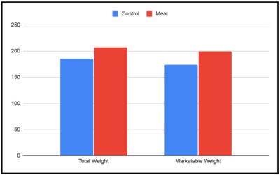 Yield results from Passion Garden’s FLT Program trial, contrasting the control group (blue) versus the group treated with Mesquite Bean Meal (red).
